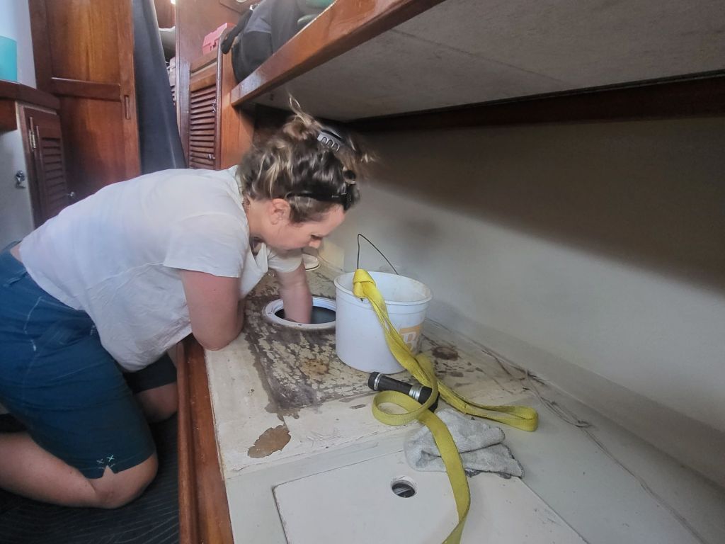 Changing the oil in our diesel engineOur engine is a 30 horsepower Yanmar diesel. Despite its relatively low hours, it does require a lot of maintenance. The engine is extremely important on a sailboat. Yes, you can go without one, but it is very handy to motor in and out of ports, maneuver in anchorages and power through strong headwinds and bashing waves. Sailing can be dirty, hot, painful, stressful and sometimes downright disgusting. Jeremyah shown here contorting himself behind the engine to replace the packing gland. The bilge is the armpit of a sailboat. It collects excess waste from the engine and other gray water leaks. Amanda had a great time cleaning it out. Cleaning out the water tanksOn a different note, Christmas came early! We scored a new foresail/jib for super cheap! Our old one is showing some wear at the top and we were hoping to find a backup or a better sail to use instead!