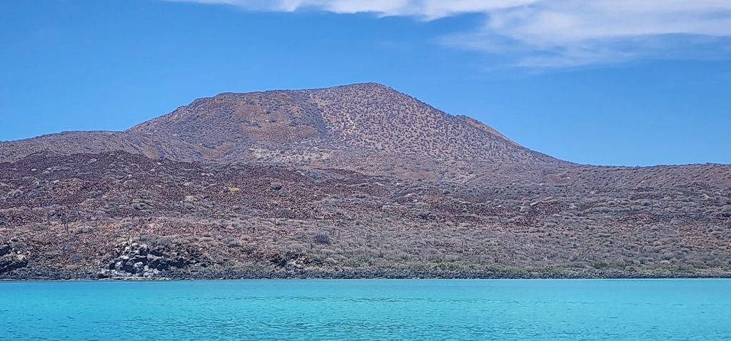 This photo was taken on approach to Isla Coronados. The island has a volcano, white sand beaches and rugged volcanic coastal geology.